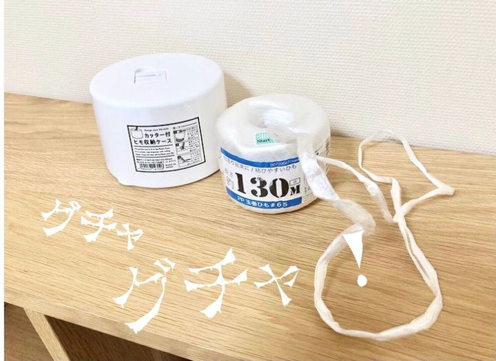 こんなグチャグチャになる前に、見た目もスッキリ収納出来て、機能的なセリアの「カッター付きヒモ収納ケース」でビニール紐を収納してみてはいかがでしょうか?