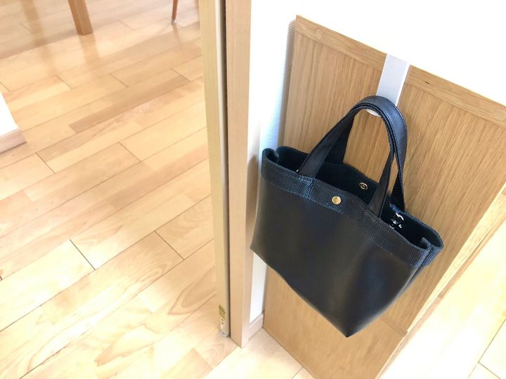 玄関でエコバッグや日傘などをお出掛けグッズを掛けたり、忘れ物をしないように目につくところに子供の学校用品を掛けたり。