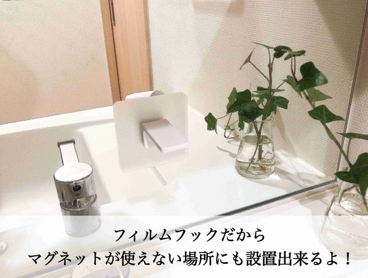 でもこちらの商品はフィルムフックタイプなので、マグネットが付かない鏡や平らな面なら使用出来ます。