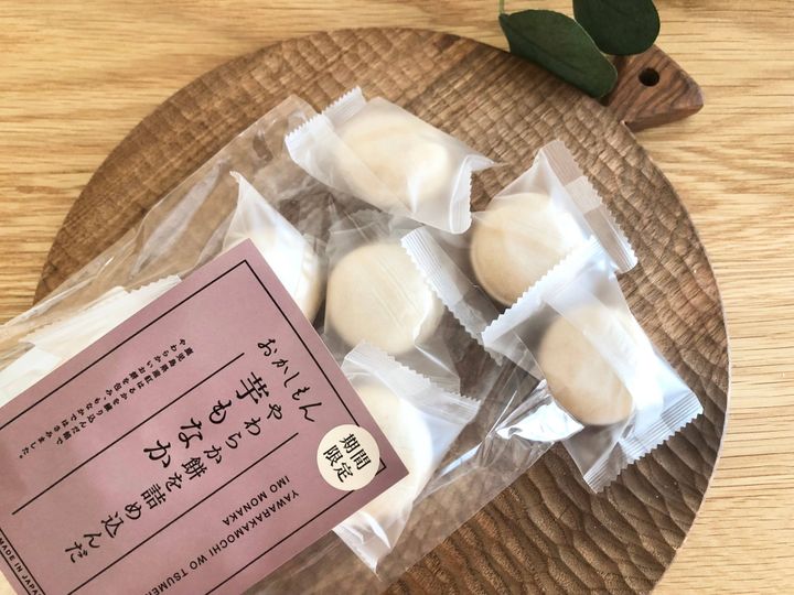 こちらの商品は、鹿児島県産の紅あずまというお芋を使用した餡で、やわらかいお餅を包み込んだもなかです。
