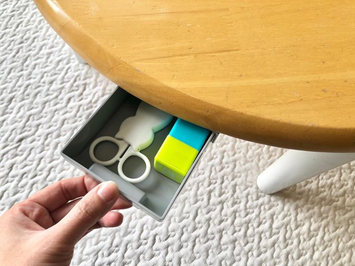 ですが引き出しを作ることで、テーブルで子供が普段使用するスタンプやミニハサミなどの細かい文房具をスッキリ収納することができます。