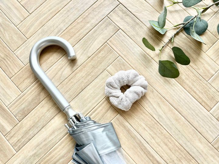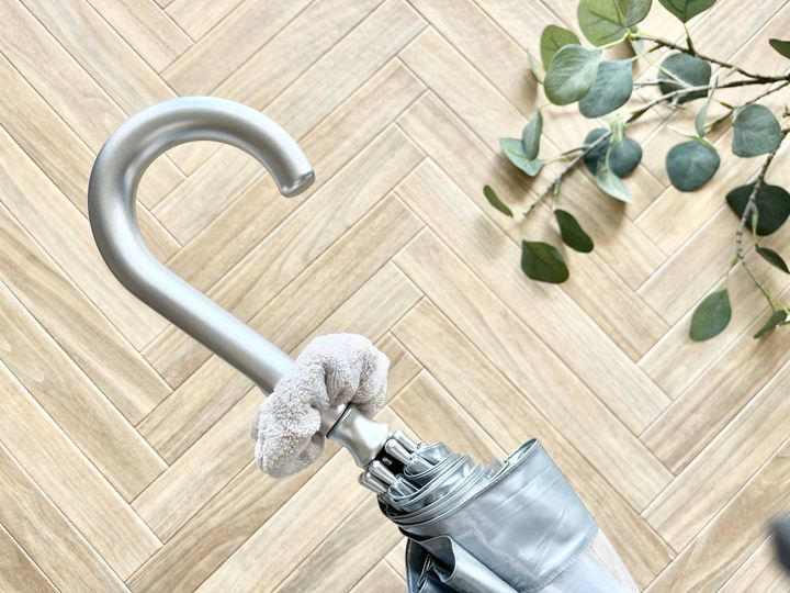 「傘用吸水シュシュ」を使えば、雨で濡れた傘をノンストレスで持ち運べますよ。