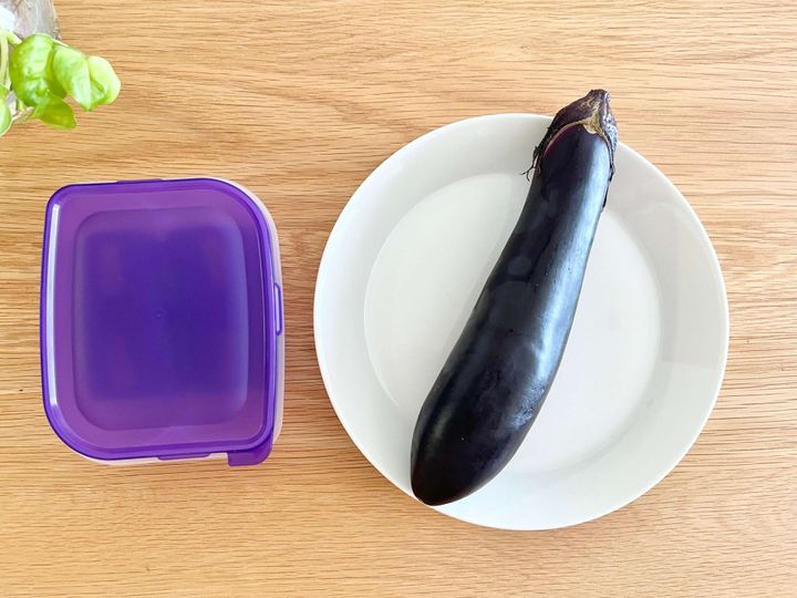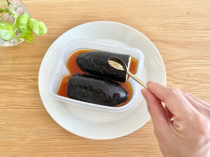 お好みで生姜を混ぜた麺つゆを、容器の4分の1~3分の1まで入れて、切ったなすの断面を下にして容器に入れます。そして少量の油(小さじ1程度)を、スプーンなどでなすの表面に塗ります。