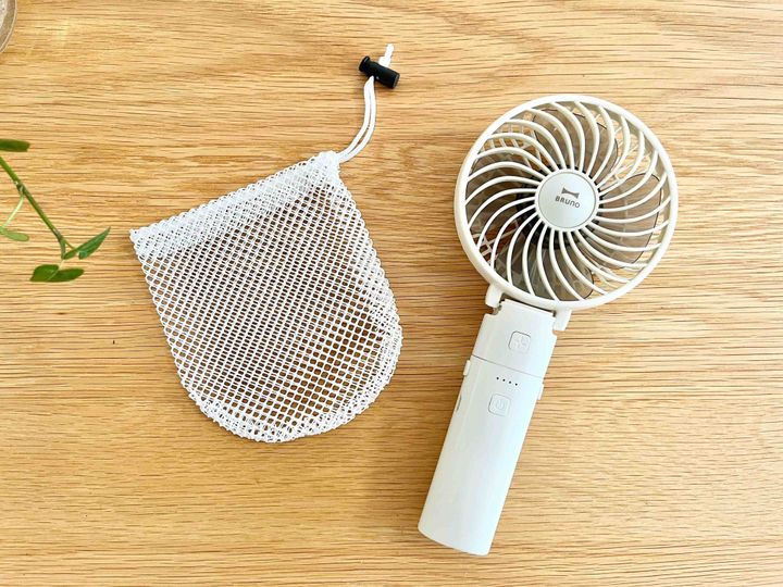 商品自体は、メッシュ素材の巾着のようなデザインになっています。商品サイズは、横120mm×高さ130mm(紐やコードストッパーは除く)。ハンディファンの対応サイズは、直径105mm×奥行40mmとなっています。但しサイズや形状によっては使用できない場合もありますのでご注意くださいね。
