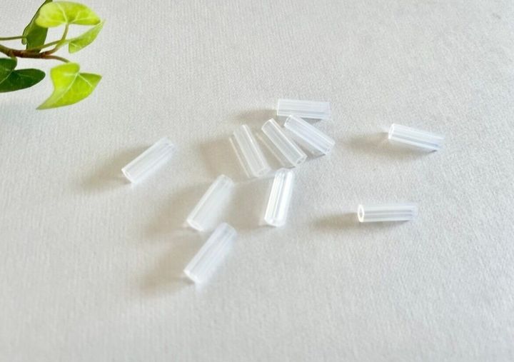 商品自体は長さ約1.5cmぐらいのミニサイズで、ストローを短く切ったようなシリコーン製のチューブです。内容量は1袋あたり10個入り。ボールの直径が約2.3mmのボールチェーンに対応しています。