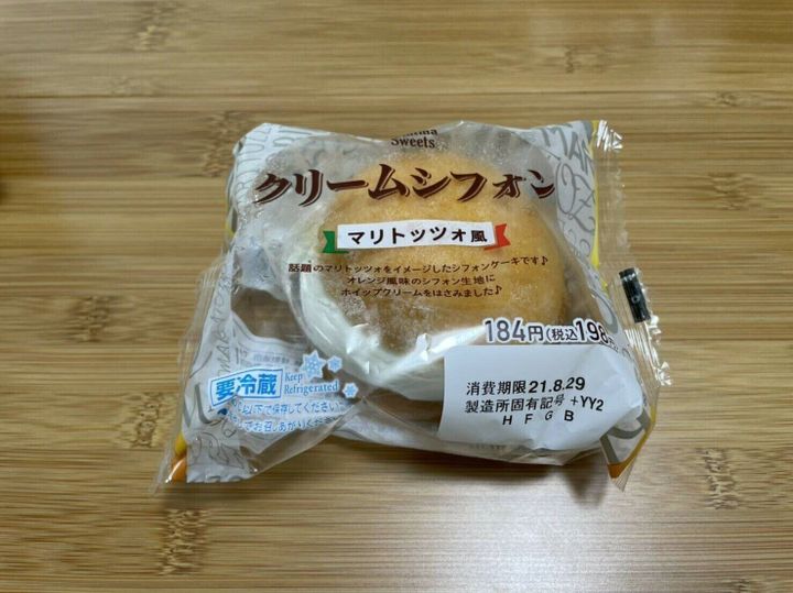 オレンジ風味のシフォン生地にホイップクリームをサンドした、マリトッツォをイメージしたシフォンケーキ。マリトッツォ「風」なので、生地もローソンやセブンイレブンのものとは違い、しっとりしたシフォン生地です。袋を開けてみるとオレンジの香りがふわ~っとして食欲をそそります。食べてみると、マリトッツォとは少し違う味ですが、これはこれでおいしくて、コーヒーと合いそうな感じでした。