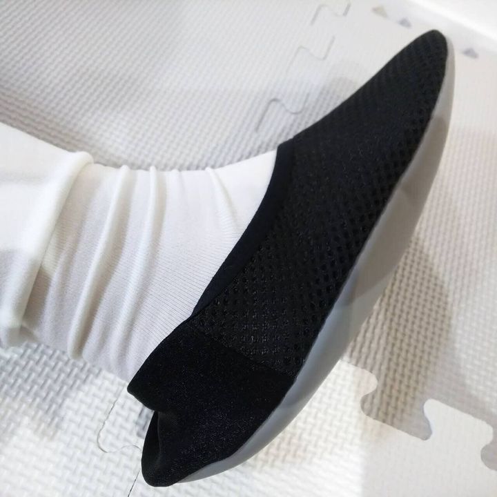 スリッパというよりも、靴下の感覚に近いです。嬉しいことに中底は思ったよりクッション性があります。アッパーが足にピタっとくっついてくれるので、足早に歩いても全く脱げません。すべって転ぶ心配もない感じです。