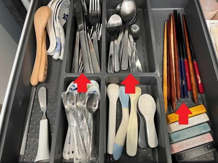 引き出しにもともとついていた収納を生かして、アイテムごとに分けているつもりですが、スプーンやフォークの大小が混じってしまっていたり、常用のお箸と来客用のお箸が混じってしまっていて、目的のモノをサッと取り出すことができません。