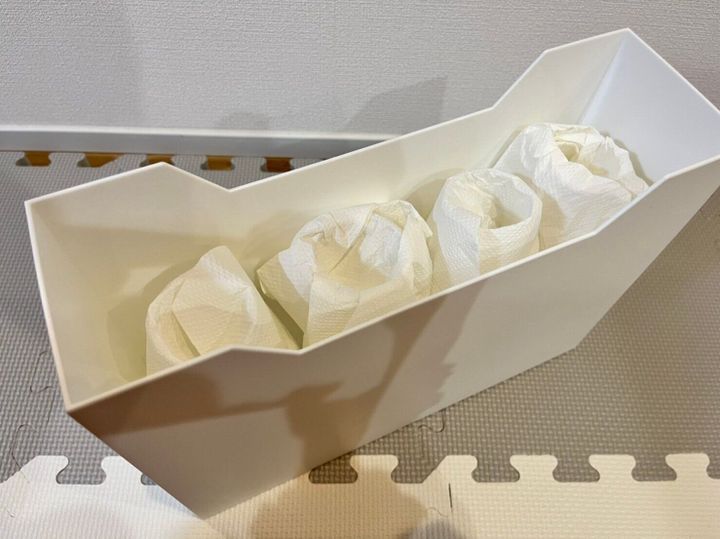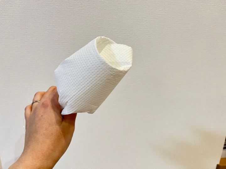 このまま収納してもいいのですが、ここでひと手間!出し入れする際にグラスどうしが当たるのを防ぐために、わが家ではキッチンペーパーを巻いて収納しています。ひと手間ではありますが、これでグラスが欠けたりするリスクを下げられます。