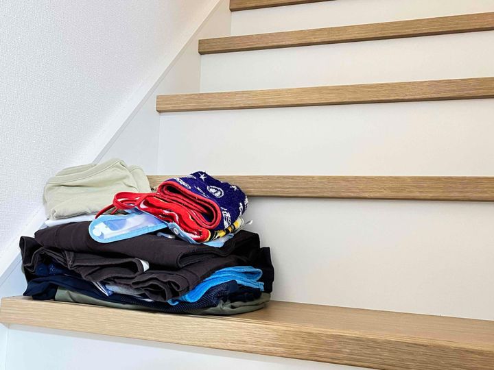 1階から2階にモノを持って上がる行動って意外と面倒ですよね。そのため、洗濯し終えて畳んだ服を階段についつい置いてしまうのが日常茶飯事でした。でも、子どもが階段を昇ったりするときに服を踏んで滑ったりして思わぬ事故につながってしまったら危険。そこで見直すことにしました。