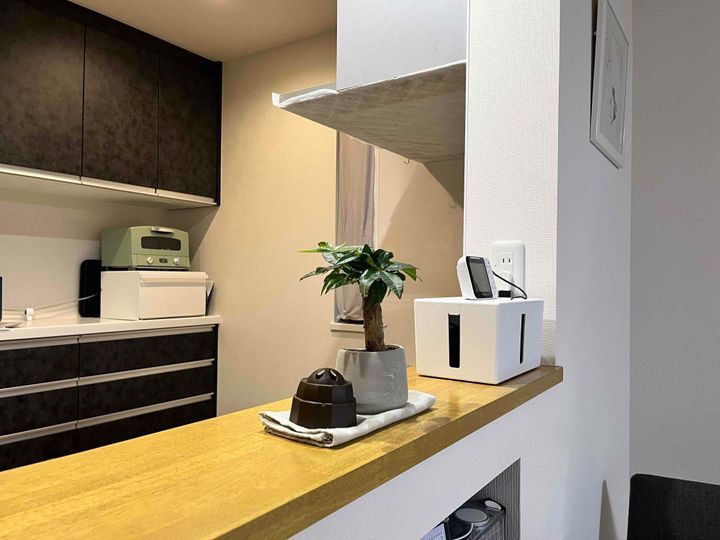 2つ目は、あえてキッチンカウンターの上にインテリアやモノを置いて、郵便物などを置けないようにすることです。キッチンカウンターの上はきれいにしようと思って、インテリアを含めて何も置いていなかったのですが、逆に普段から観葉植物などのインテリアを置くようにしました。コバエ捕獲器もインテリアかのように飾っています(笑)そうすることで、意識が変わったのと、モノを置ける場所も減ったので、郵便物を置きっぱなしにすることがぐんと減りました。