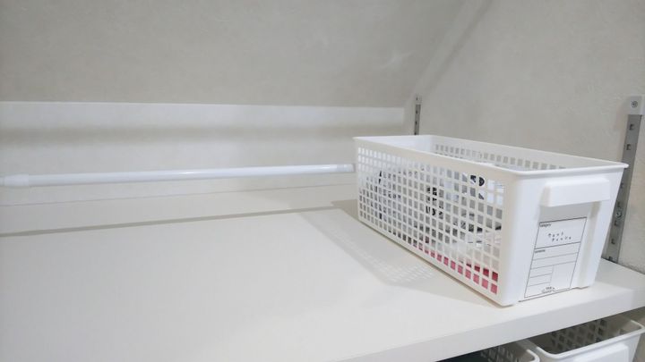 つっぱり棒を収納ケースの奥に突っ張ることで、奥行を短くすることに成功しました。