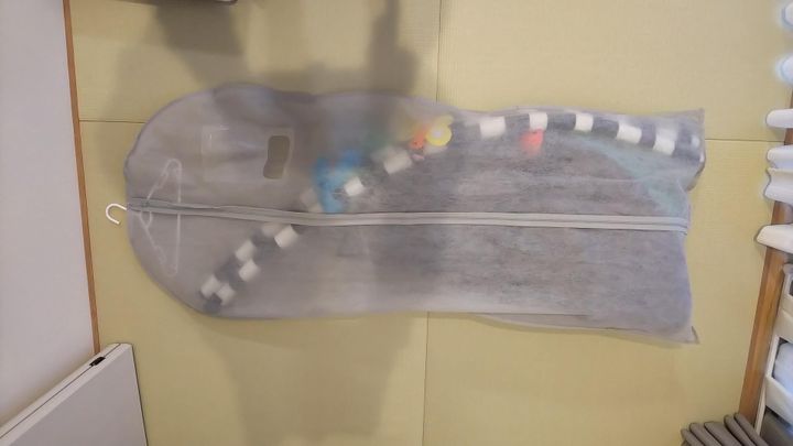 あっという間に"かける収納"に変身しました!クローゼットにもかけられて、収納スペースも少なく済む上に、ほこりもかぶらないので、とてもおすすめできる収納法です。同じような布製のベビージムをお持ちの方は、ぜひ試してみてください。