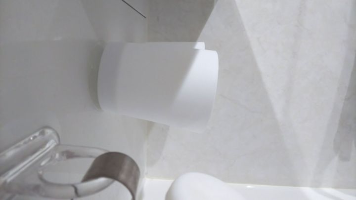 取り付けてみると横から見ると少しななめになっていて水切りができるようになっています。使うときは吸盤からコップをはずすようにして使います。使用後は念のためコップの水気をよくきってから、吸盤に戻して使っています。