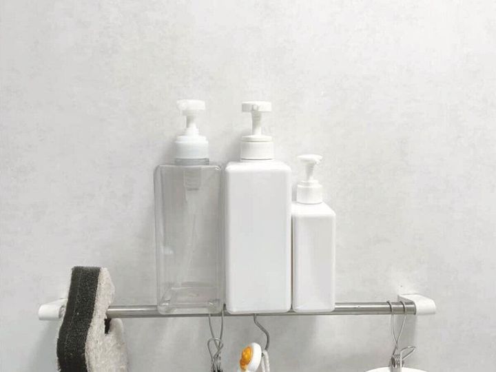 シャンプーやボディーソープのボトルは、バーの上に置いて、専用のラックは使いません。