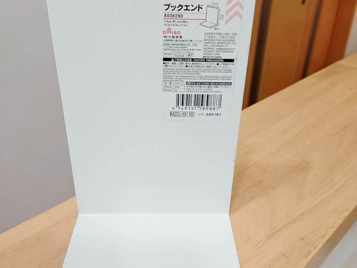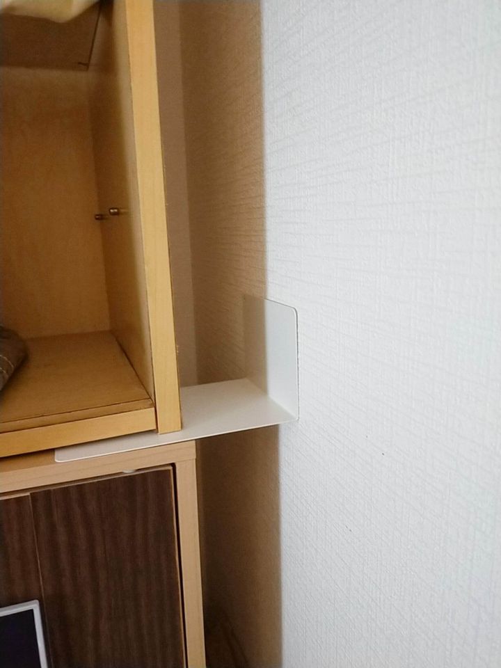 棚板の間に100円ショップで買ったブックエンドを差し込んで