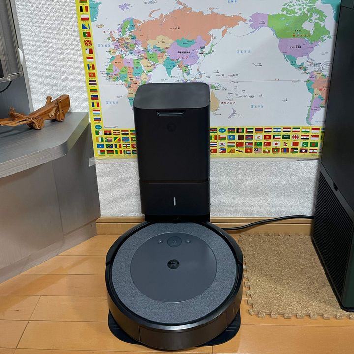 3日後、我が家にやってきたのは、アイロボットのルンバi3+<点検済みのリユース品>です。どんな家でどのように使われてきたのか…そこまで想いを巡らせてしまう方にはオススメできませんが、箱は使用感ありでしたが本体はきれいな状態でした。届いて念のため軽く掃除して設置しました。