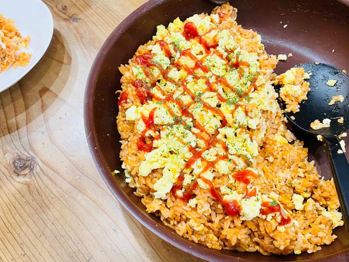 チキンライスができたら、あとは炒り卵を上にのせるだけ。ケチャップとパセリをかけて、『包まないオムライス』の完成です!おいしそう!