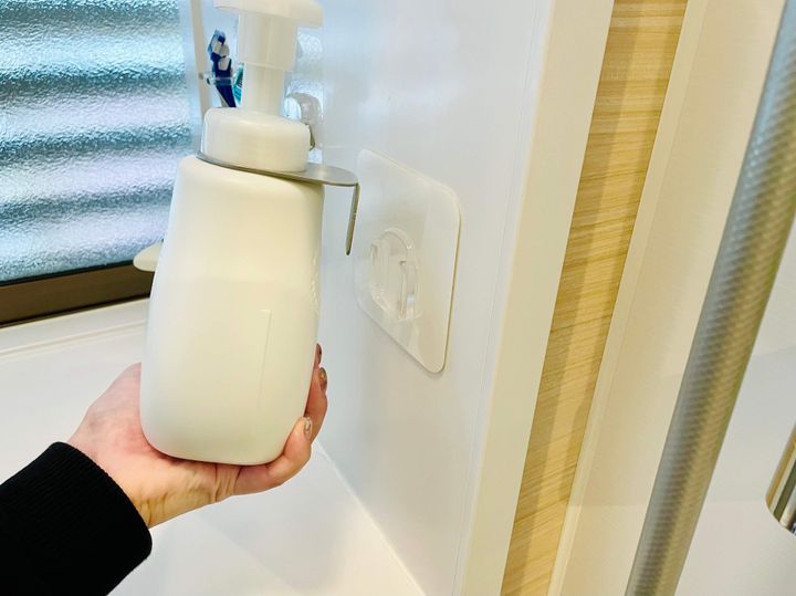 泡ボディソープはボトルの口径が大きく、100均には合うものが無かったので、【オテル】の「マジックシート 泡ソープホルダー/1650円」で浮かせています。こちらも、繰り返し貼ってはがせるタイプ。