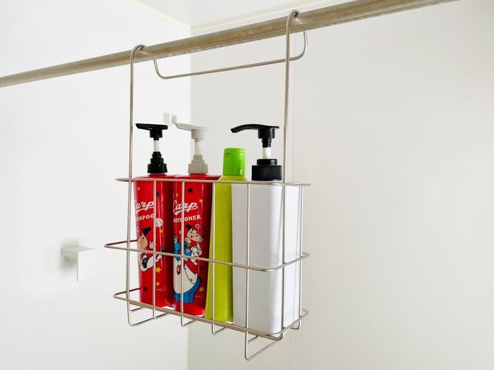 シャンプーなどのボトル類は、【ベルメゾン】の「タオルバーに掛けられるパーソナルバスラック/3520円」にまとめています。