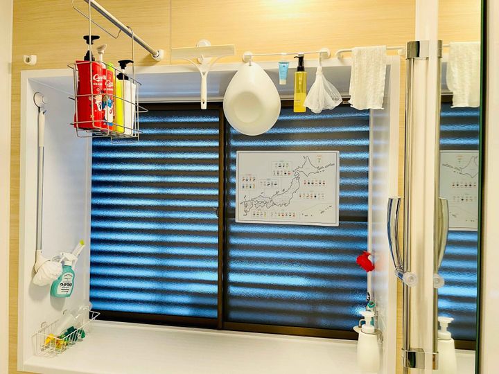 洗面器などの小物は、【ニトリ】「浴室マグネット」のタオルバーとフックを使って浮かせています。
