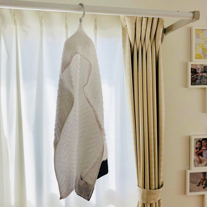 タオルハンガーに干すよりも隙間ができるので、風の通りがよくなる=早く乾くんです!