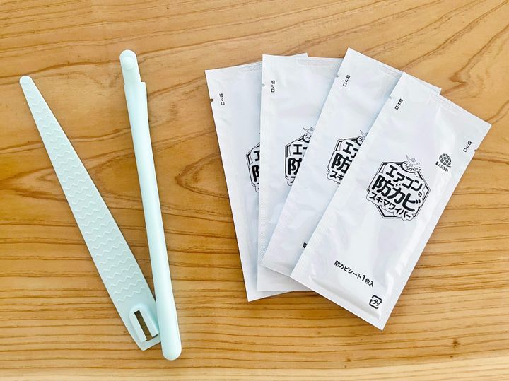 組み立て式のワイパーと、防カビシートが4枚入っています。シート1枚で、エアコン1台分の吹き出し口の防カビができますよ。