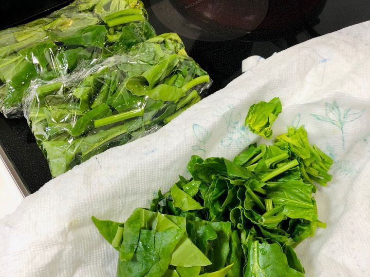 例えば、小松菜などの葉物野菜。使う分を切る「ついでに」、全部切って、残りはラップに包んで冷凍。