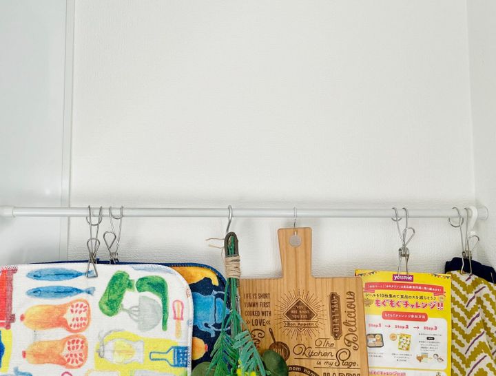 つっぱり棒と組み合わせて使っているのは、挟んで引っかけられるクリップと、S字フック。この2つがあれば、軽いものなら大抵かけられます。
