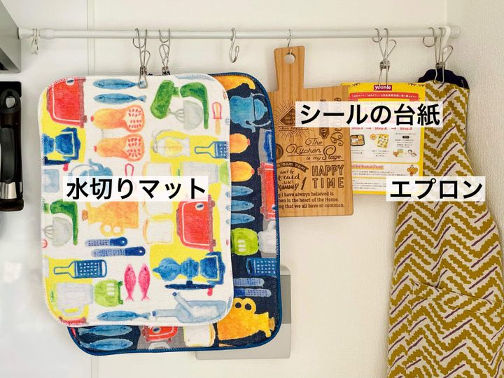 エプロンはここにあると、揚げ物をする前にパッとつけられて都合が良いんです。水切りマットも、使った後はここにかけて乾かしていますよ。