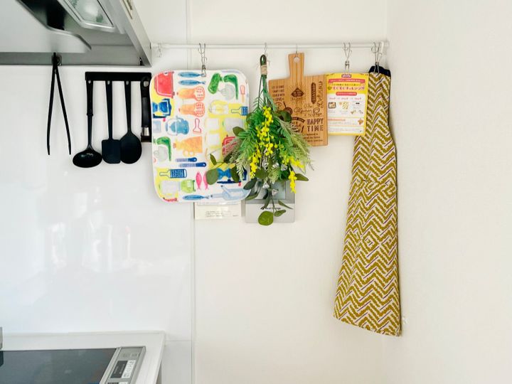 キッチンの壁につっぱり棒を1本設置しただけで、使いたいものがサッと取れて、とても便利になりましたよ。