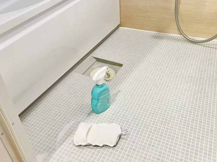 カビを取り除く前に、まずは汚れの除去。皮脂汚れや水アカ、石鹸カスなど、カビの栄養源となる汚れをお風呂用洗剤で落とします。