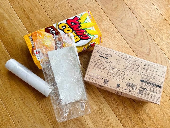 お菓子やティッシュの空き箱、ラップの芯、卵のパックなどの、『授業で使うシリーズ』。