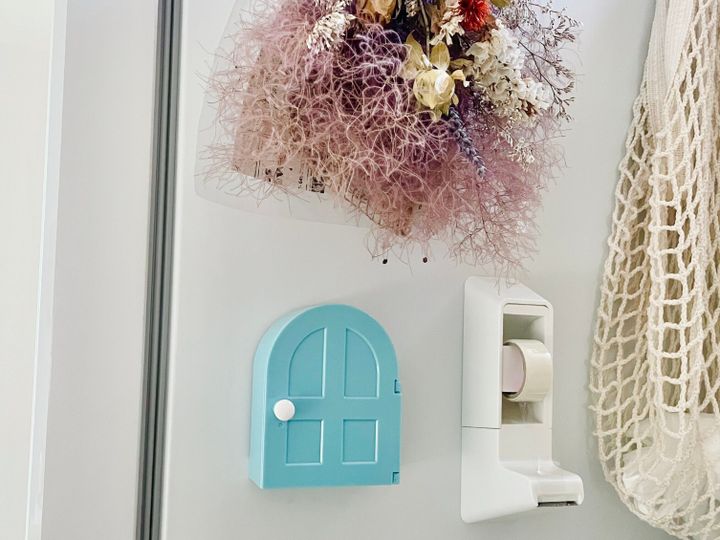 冷蔵庫の横に付けてみました。小さなドアが可愛くて、つい開けたくなってしまいます。