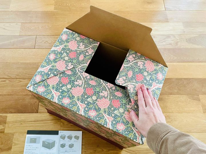 「ウィリアム・モリス」の文字の下部分は、くり抜いて持ち手にすることもできますよ。カラーボックスに入れて使う場合は、持ち手があると便利ですね。