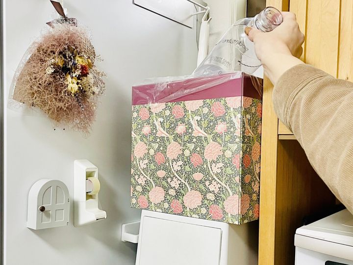 ポリ袋を入れて、缶やペットボトル用のゴミ箱に。