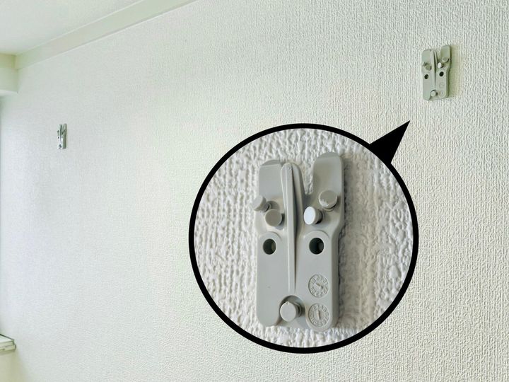 設置方法は、いたってシンプル。付属の石膏ボード用ピンで金具を取り付け、上から本体を差し込むだけ。取り付け位置のガイドも付いているので、安心です。