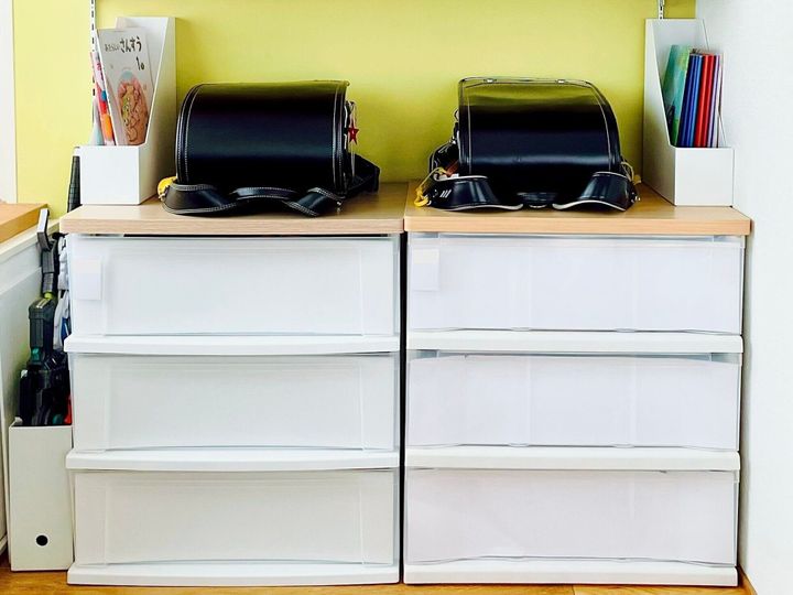 ランドセル専用のラックは使わず、リビングの一角にチェストを2つ並べただけです。