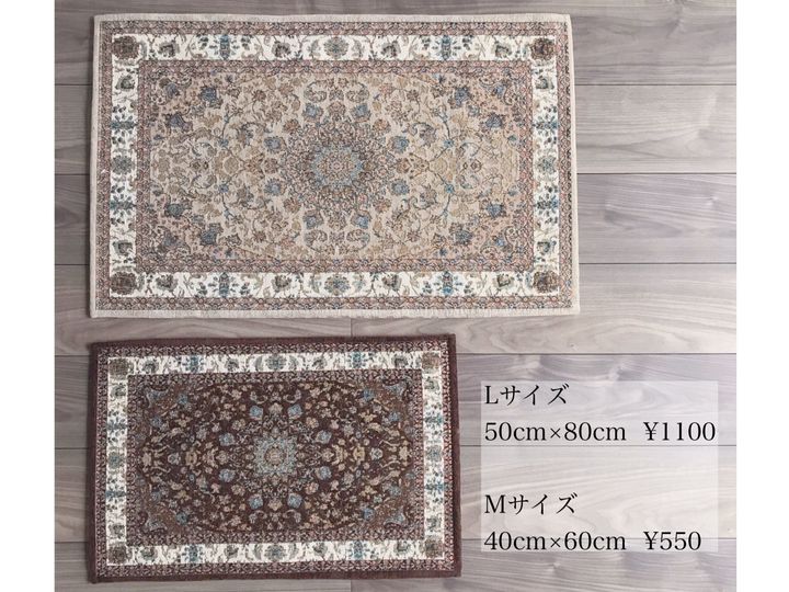 Mサイズが40cm×60cmで¥550(税込)、Lサイズが50cm×80cmで¥1100(税込)です。敷きたい所に合わせてサイズを選べます。