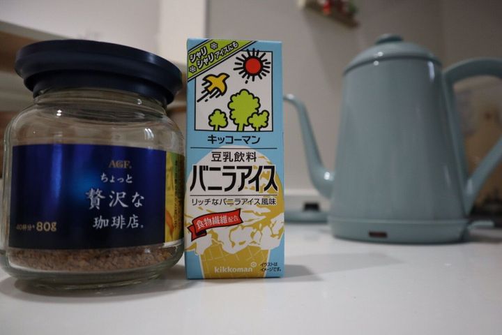 スプーン2杯程度のインスタントコーヒーを少量のお湯で溶かし、そこにバニラアイス味の豆乳を注ぐだけ!