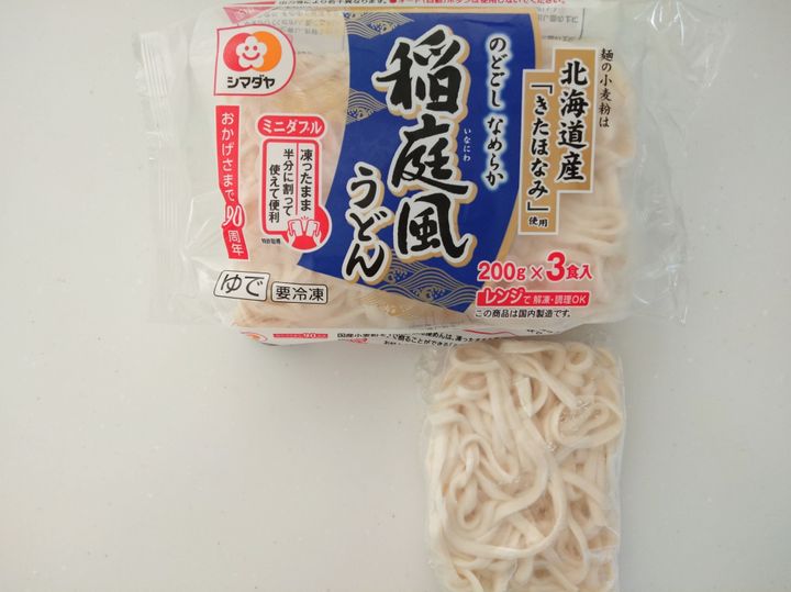 ちなみに、シマダヤの『冷凍稲庭風うどん』は、ミニダブルという作りになっていて、凍ったまま半分に割って使うことができるので、このように子どもの分だけ使いたいときにも便利です。