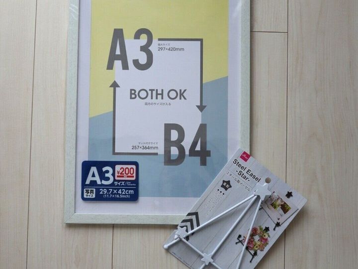 私がダイソーで見つけた高見えグッズは、A3判の額縁とイーゼルで、額縁は220円(税込)、イーゼルは110円(税込)と、セットで購入してもなんとたったの330円!