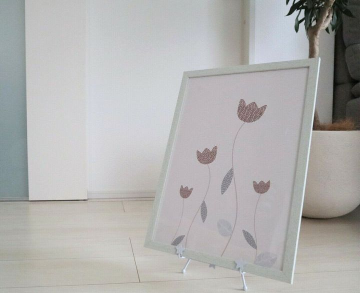 A3判ほどの大きさになると壁掛けをイメージしがちで、私もそのつもりでしたが、額縁と並んで売られていたイーゼルがふと目に入って合わせてみたら、とても素敵なインテリアになりました。