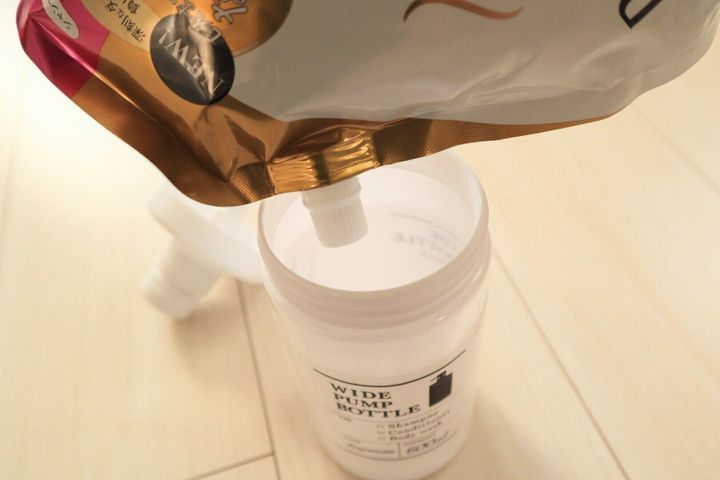 今回購入したセリアの『広口ポンプボトル』は蓋がパカッと外れるため、驚くほど詰め替えがラクになりました。大容量の詰め替えパウチを思い切り押してぐいぐい出すことができ、詰め替え作業が素早くラクに終わります。