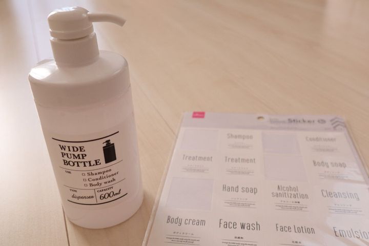 我が家では、セリアの『広口ポンプボトル(600ml) 税込110円』にダイソーの『ボトルリメイクシール 税込110円』を貼って使っているのですが、シャンプー、コンディショナー、ボディソープの3つのボトルを揃えただけで、驚くほど見た目が良くなりました。