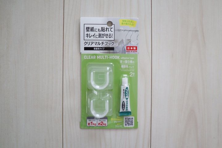 今回私が使ったのは、ダイソーの『壁紙にも貼れてキレイに剥がせる!クリアマルチフック』です。