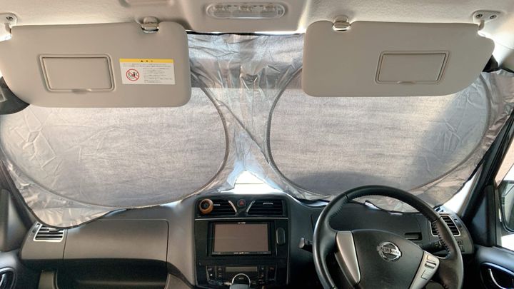サンシェードの使用方法は製品の黒い面が社内側になるようにフロントウィンドウに広げ、サンバイザーを下してシェードを抑えます。我が家のワンボックスカーのフロントガラスには、少しサイズ感が小さく感じましたが、日光は遮断できているのでこの夏大活躍間違いなしです。