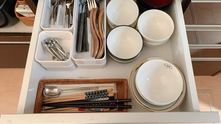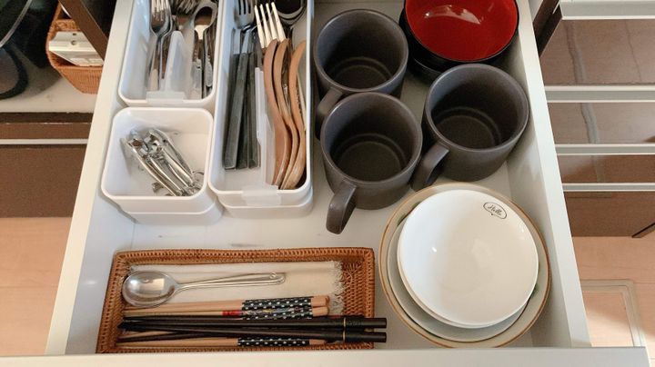 我が家の食器棚引き出しは、・お茶碗・お椀・家族用のカトラリー・来客用のカトラリーなど、よく使うものを一つの引き出しにまとめて収納しています。購入したマグは「スープ用に使いたい!」と、使う目的が決まっていたので、子ども用のお椀と入れ替えることに!
