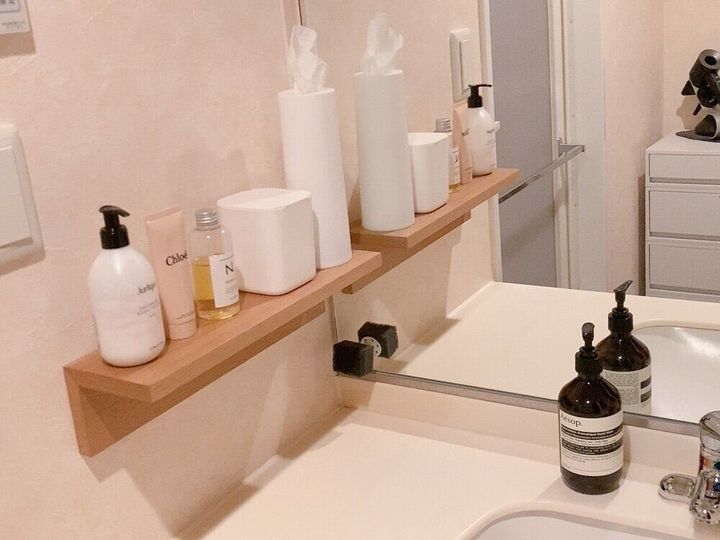築年数がたった賃貸マンションのため、浴室の壁は磁石がくっつかないので、鏡や壁にくっつけることのできるアイテムを使って浮かせる収納をつくっています。
