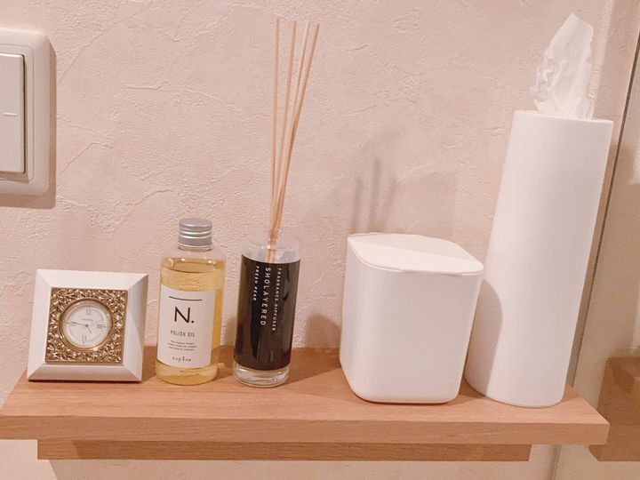 こちらは洗面所以外でも壁(石こうボード壁)さえあれば、収納スペースをつくることのできるアイテムで、いくつか種類のあるこのシリーズは他に5つも愛用しているほど大好きな商品です。ピンを外した後の穴が目立ちにくいので、我が家のような賃貸マンションにお住まいの方にもおすすめです。